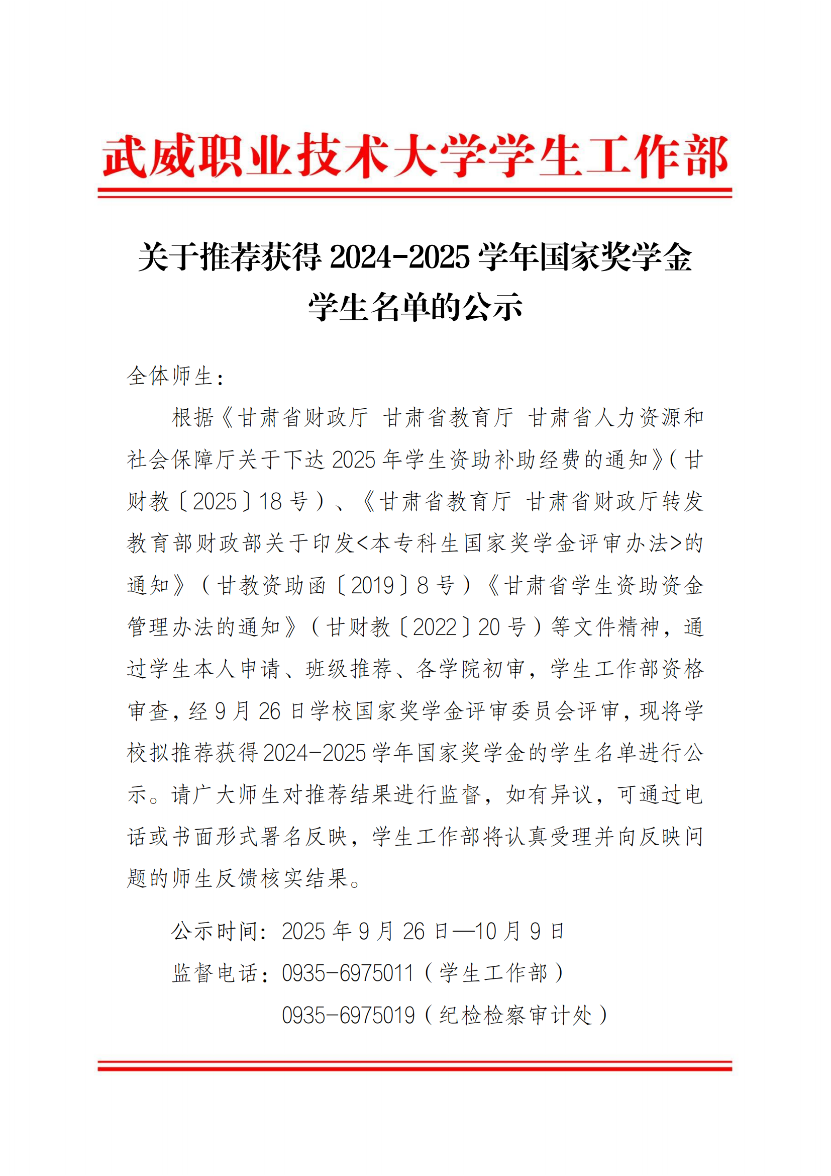 關(guān)于推薦獲得2024-2025學(xué)年國(guó)家獎(jiǎng)學(xué)金學(xué)生名單的公示
