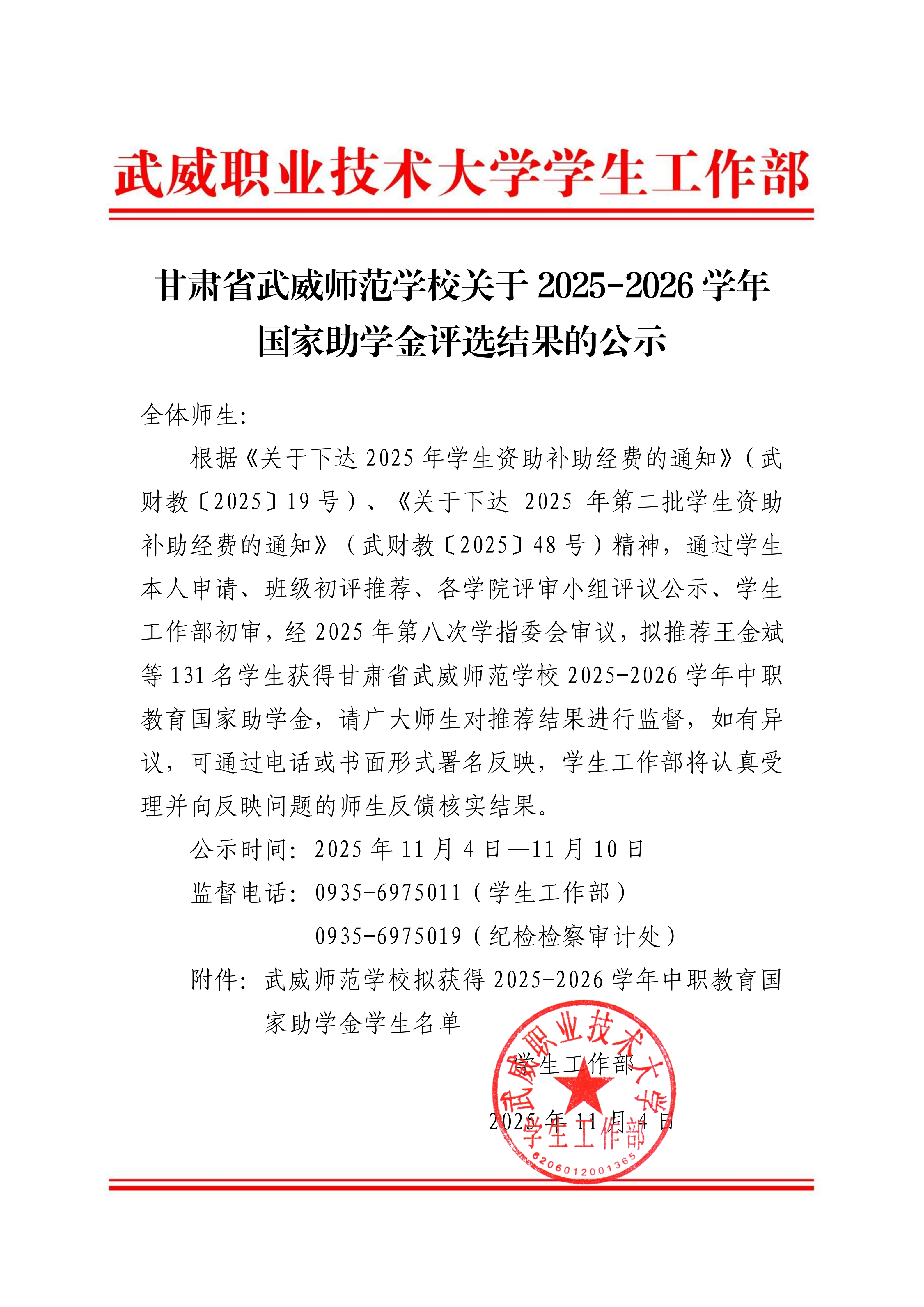 甘肅省武威師范學校關(guān)于2025-2026學年國家助學金評選結(jié)果的公示