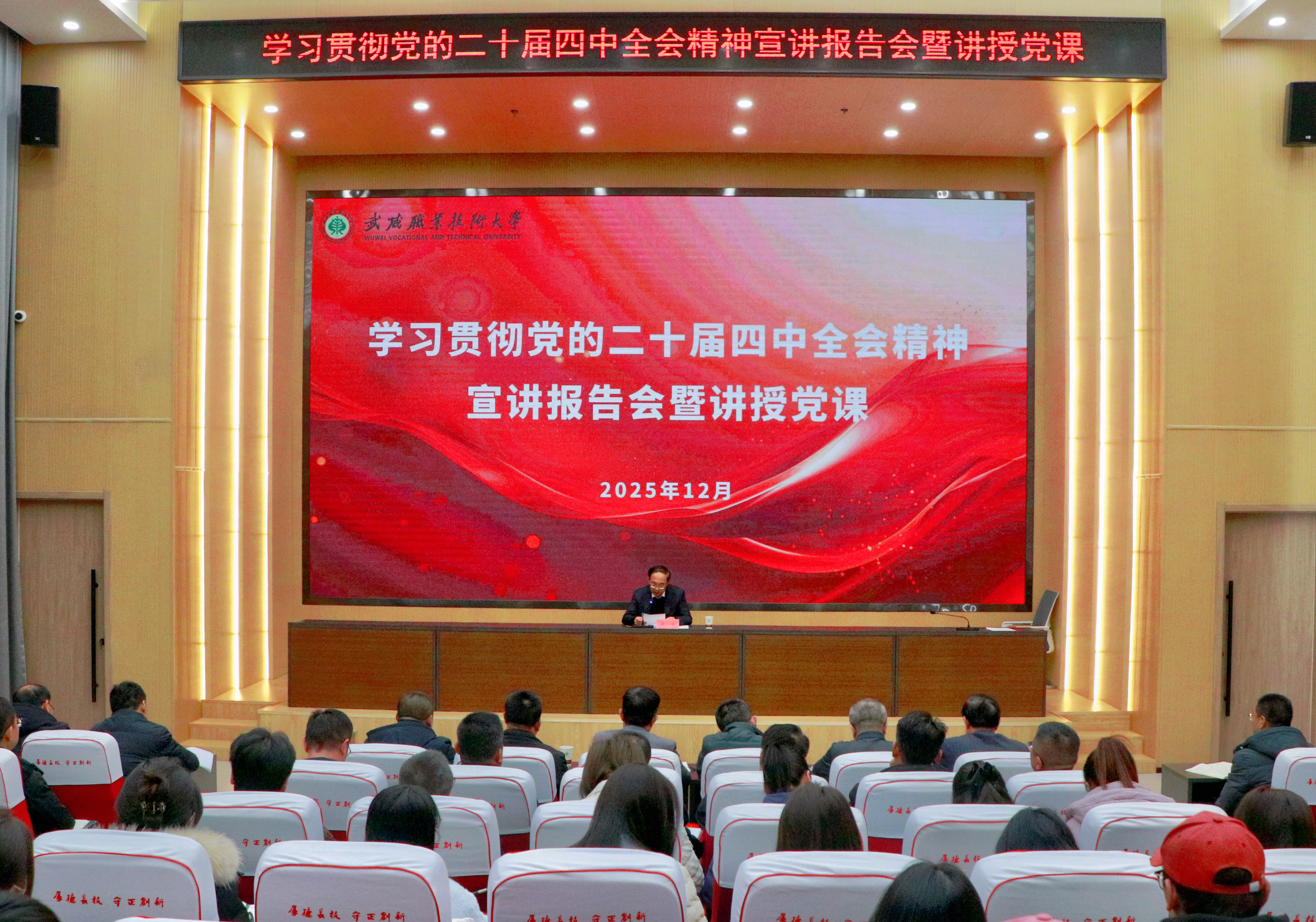 12月10日,黨委書(shū)記王宏專題宣講黨的二十屆四中全會(huì)精神,并向師生講授黨課。他強(qiáng)調(diào),要深入學(xué)習(xí)貫徹黨的二十屆四中全會(huì)精神,全面把握核心要義,立足職業(yè)本科教育新起點(diǎn),奮力譜寫(xiě)學(xué)校高質(zhì)量發(fā)展新篇章,為加快推進(jìn)中國(guó)式現(xiàn)代化武威實(shí)踐貢獻(xiàn)智慧力量。黨委副書(shū)記、副校長(zhǎng)張開(kāi)禮主持報(bào)告會(huì)。